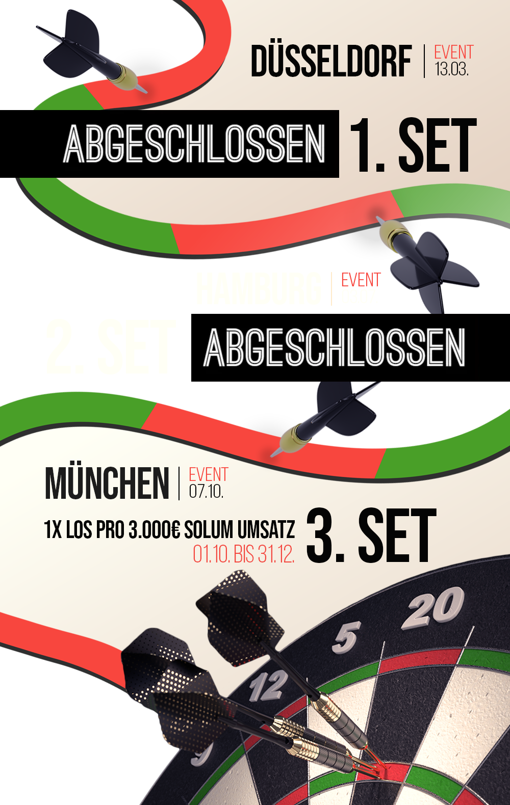 In drei Zeiträumen, die ganz im Sinne des Darts-Sports als “SET” bezeichnet werden, haben Sie die Gelegenheit an einem Vor-Ort-Event in Deutschland sowie an der Kampagne teilzunehmen. Dabei gibt es drei Wege, zu gewinnen: