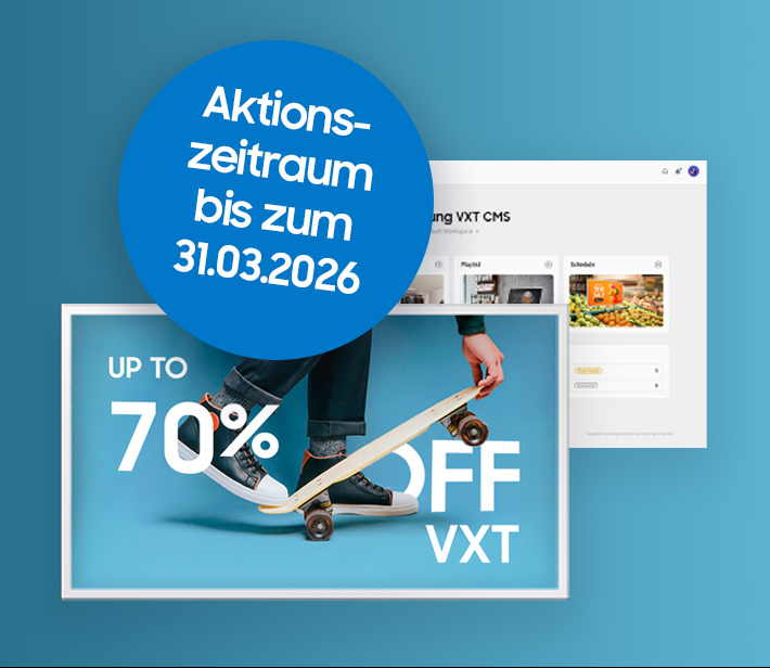 Die Samsung VXT Bundle Promotion kombiniert zwei starke Lösungen: Beim Kauf eines stromsparenden Samsung E-Papers erhalten Sie bis zum 31.03.2025 ganze 70 % Rabatt auf eine VXT-Lizenz Ihrer Wahl. Das Bundle bietet maximale Effizienz: Minimale Energiekosten treffen auf einfache, zentrale Content-Verwaltung. Ideal für alle, die Digital Signage schnell, flexibel und aufmerksamkeitsstark umsetzen möchten.