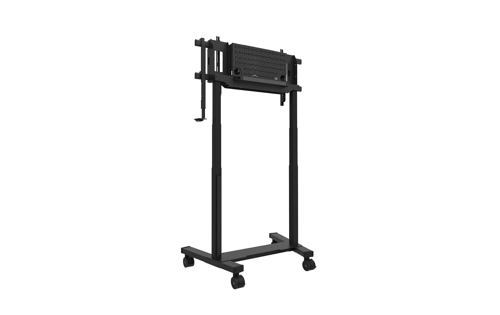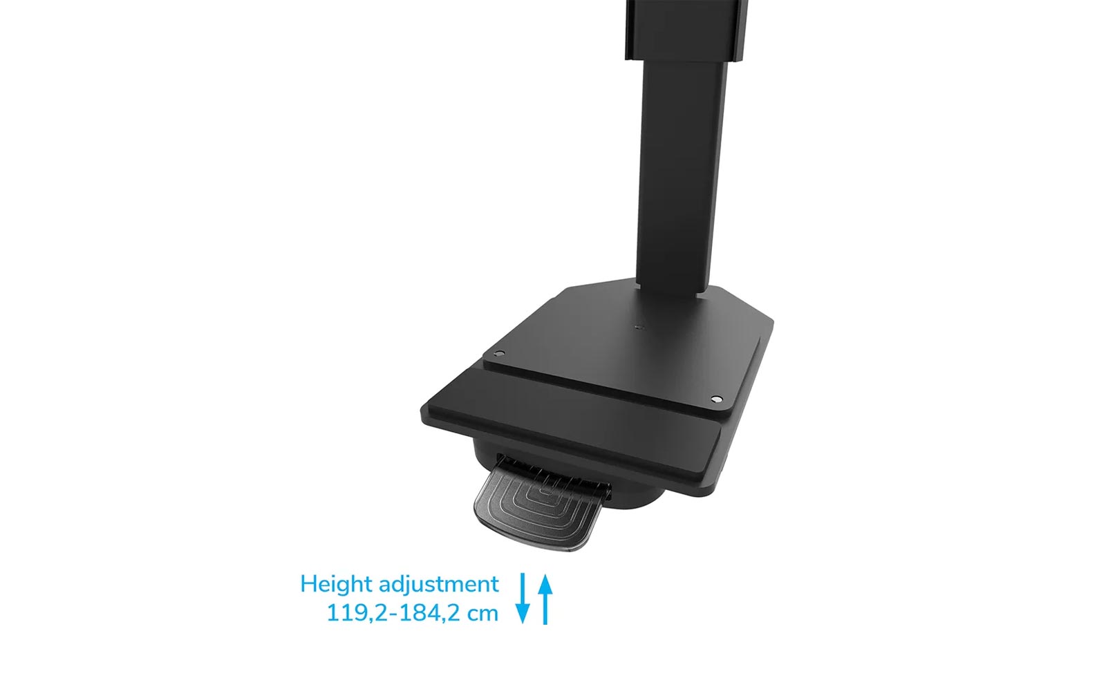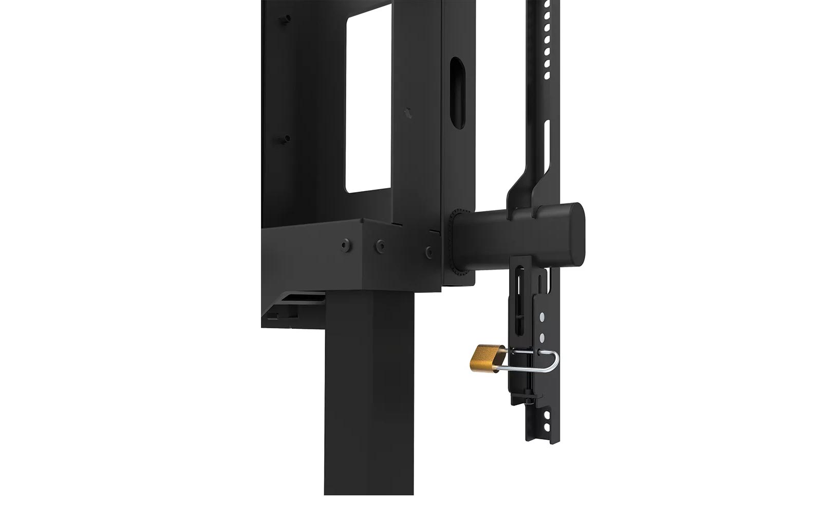 Der Neomounts FL55-975BL1 MOVE Lift XL ist ein motorisierter Bodenständer für große Displays bis 115" und eine maximale Tragkraft von 160 kg. Die robuste Konstruktion bietet eine motorisierte Höhenverstellung von 65 cm, die sich über ein leicht zugängliches Bedienfeld steuern lässt. Ein integriertes Anti-Kollisionssystem gewährleistet dabei eine sichere Anpassung der Höhe. Zusätzlich besteht die Möglichkeit, das Display über verschließbare Halterungen mit einem Vorhängeschloss (nicht im Lieferumfang enthalten) gegen unbefugten Zugriff zu sichern. Ein abschließbares, belüftetes Hardwarefach mit optionaler Kabeldurchführung sorgt für eine ordentliche und geschützte Aufbewahrung angeschlossener Geräte.