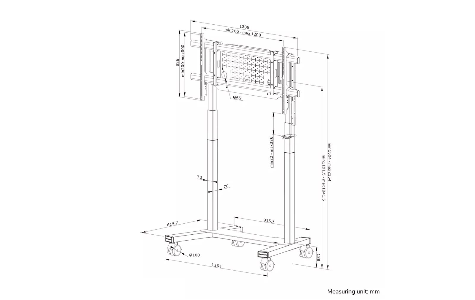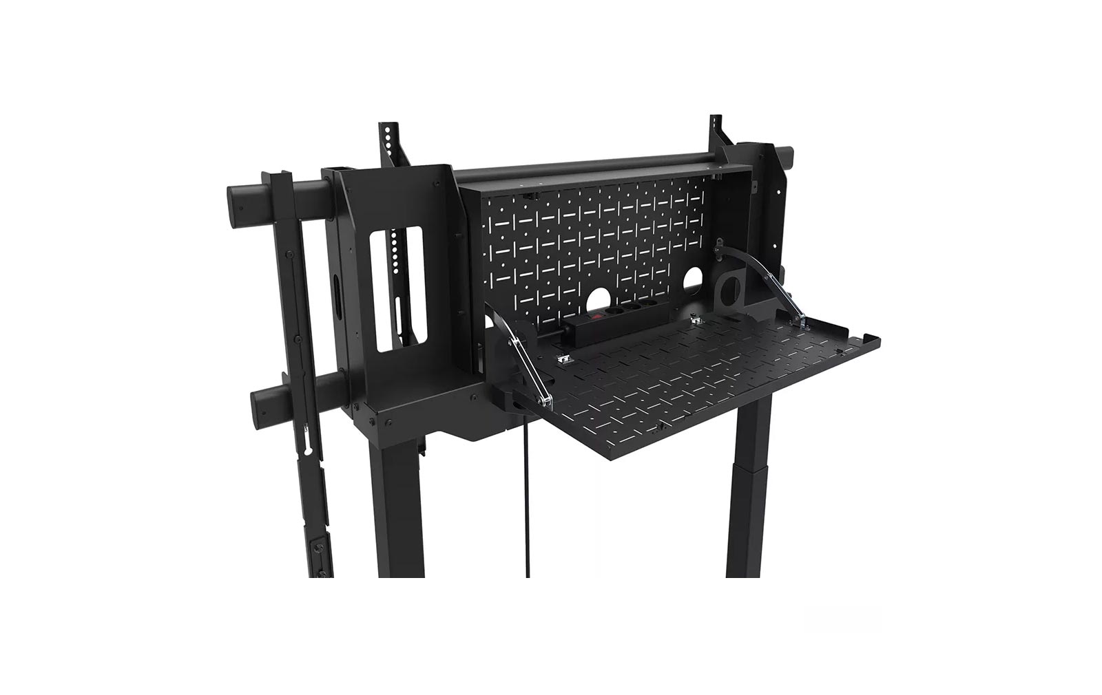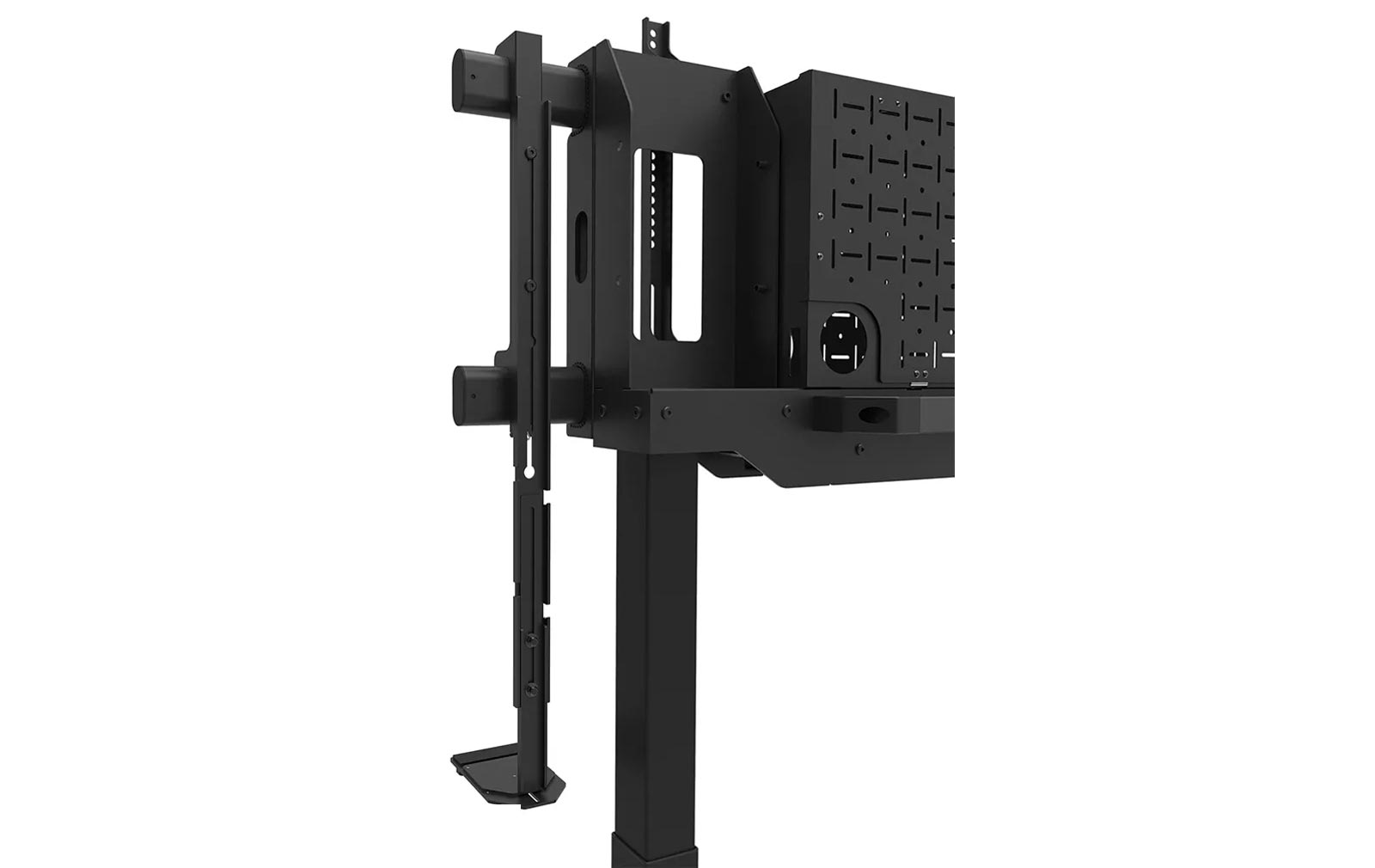Der Neomounts FL55-975BL1 MOVE Lift XL ist ein motorisierter Bodenständer für große Displays bis 115" und eine maximale Tragkraft von 160 kg. Die robuste Konstruktion bietet eine motorisierte Höhenverstellung von 65 cm, die sich über ein leicht zugängliches Bedienfeld steuern lässt. Ein integriertes Anti-Kollisionssystem gewährleistet dabei eine sichere Anpassung der Höhe. Zusätzlich besteht die Möglichkeit, das Display über verschließbare Halterungen mit einem Vorhängeschloss (nicht im Lieferumfang enthalten) gegen unbefugten Zugriff zu sichern. Ein abschließbares, belüftetes Hardwarefach mit optionaler Kabeldurchführung sorgt für eine ordentliche und geschützte Aufbewahrung angeschlossener Geräte.