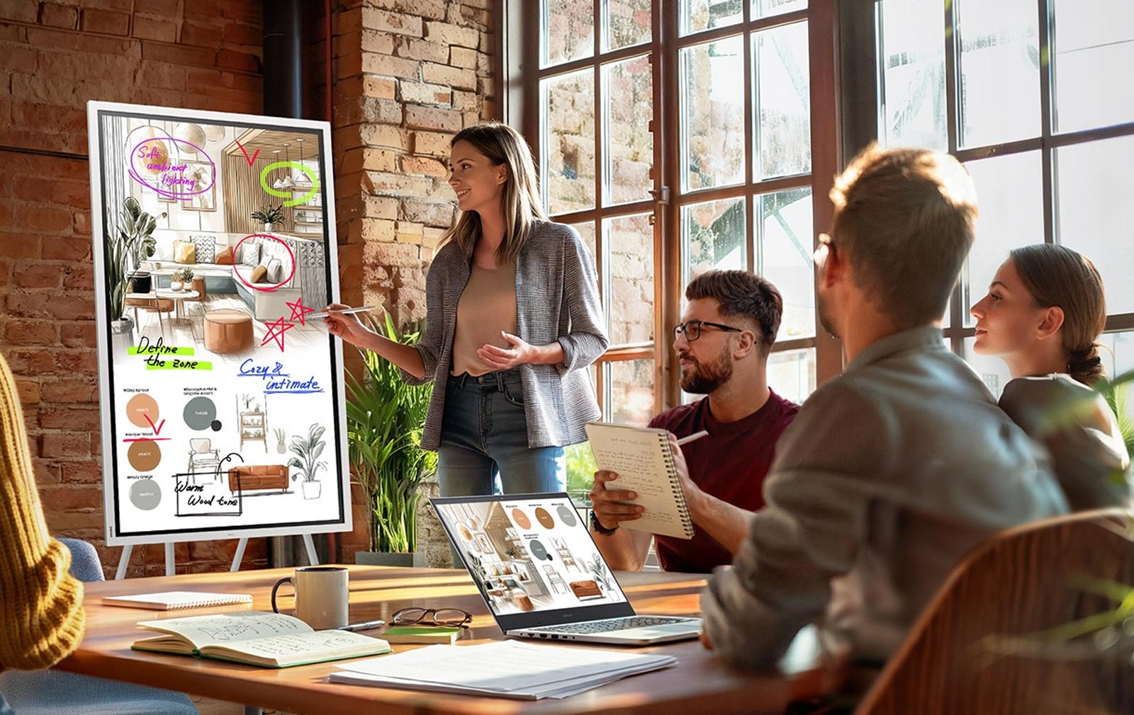 Das drehbare Design des Flip ermöglicht den Wechsel zwischen vertikalem und horizontalem Modus – vertikal für Schreiben und Mindmapping, horizontal für Präsentationen und Gruppendiskussionen. Eine einzelne Anzeige passt sich so jeder Phase der Zusammenarbeit optimal an.
