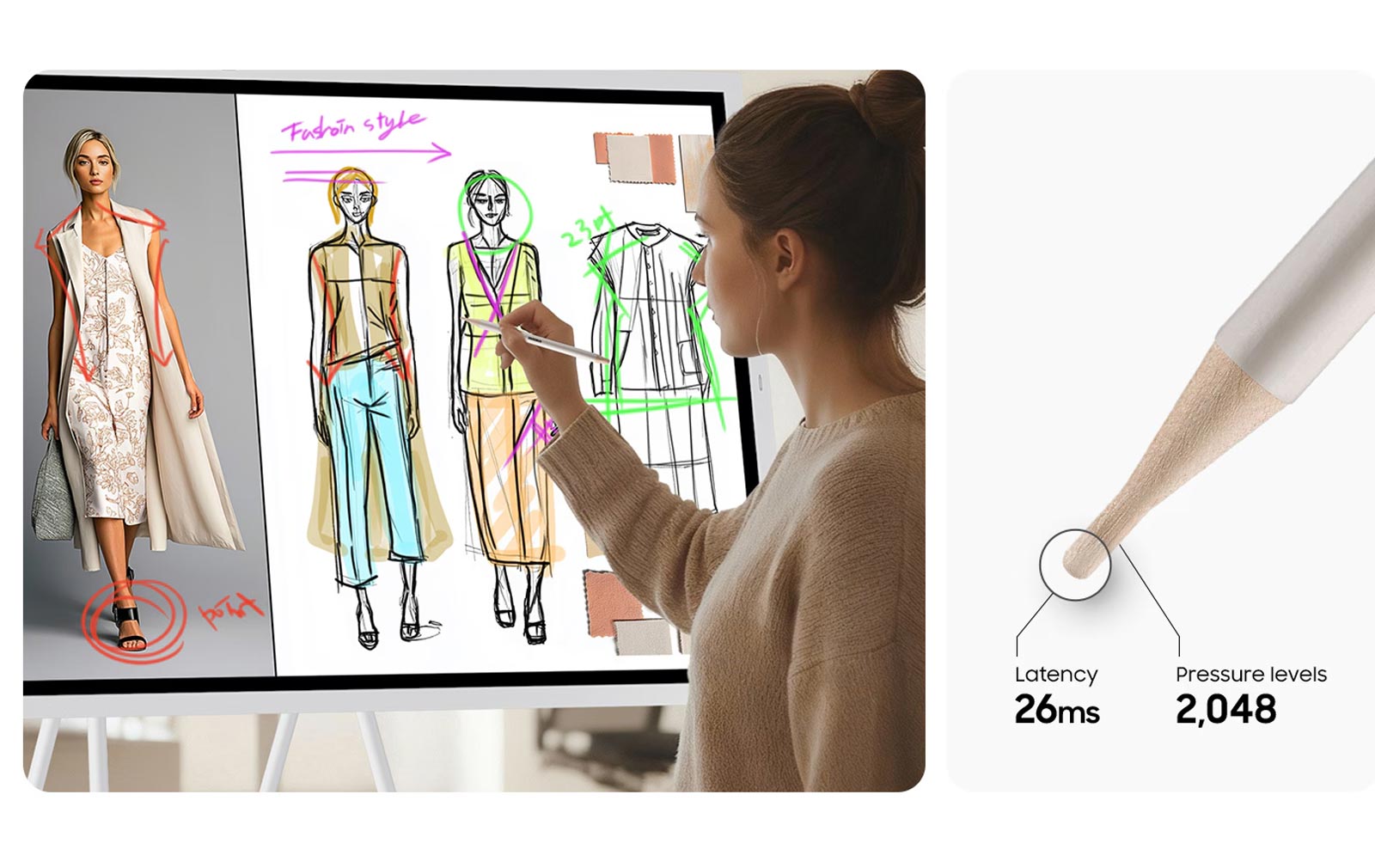 Der Samsung Flip WMFX überzeugt mit einer besonders flüssigen und präzisen Stiftperformance, die das Schreibgefühl echter Tinte nahezu perfekt nachbildet. Dank einer Reaktionszeit von nur 26 ms und 2.048 Druckstufen entstehen Linien natürlich, dynamisch und ohne spürbare Verzögerung – Ideen werden unmittelbar und detailgetreu auf den Bildschirm übertragen. Die flexible Radierfunktion ermöglicht intuitive Korrekturen mit der Hand oder Handfläche und sorgt für einen durchgehend nahtlosen, kreativen Arbeitsfluss.