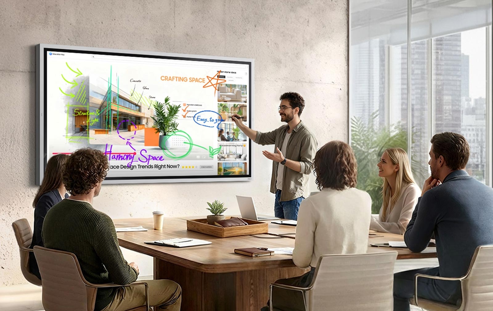 Die Effizienz von Meetings wird durch Easy Multitasking gesteigert, da mehrere Fenster gleichzeitig auf einem Bildschirm angezeigt werden können. Die Multi-Window-Modi ermöglichen das gleichzeitige Prüfen von Dokumenten, Surfen im Internet und Erstellen von Notizen – ganz ohne Bildschirmwechsel.