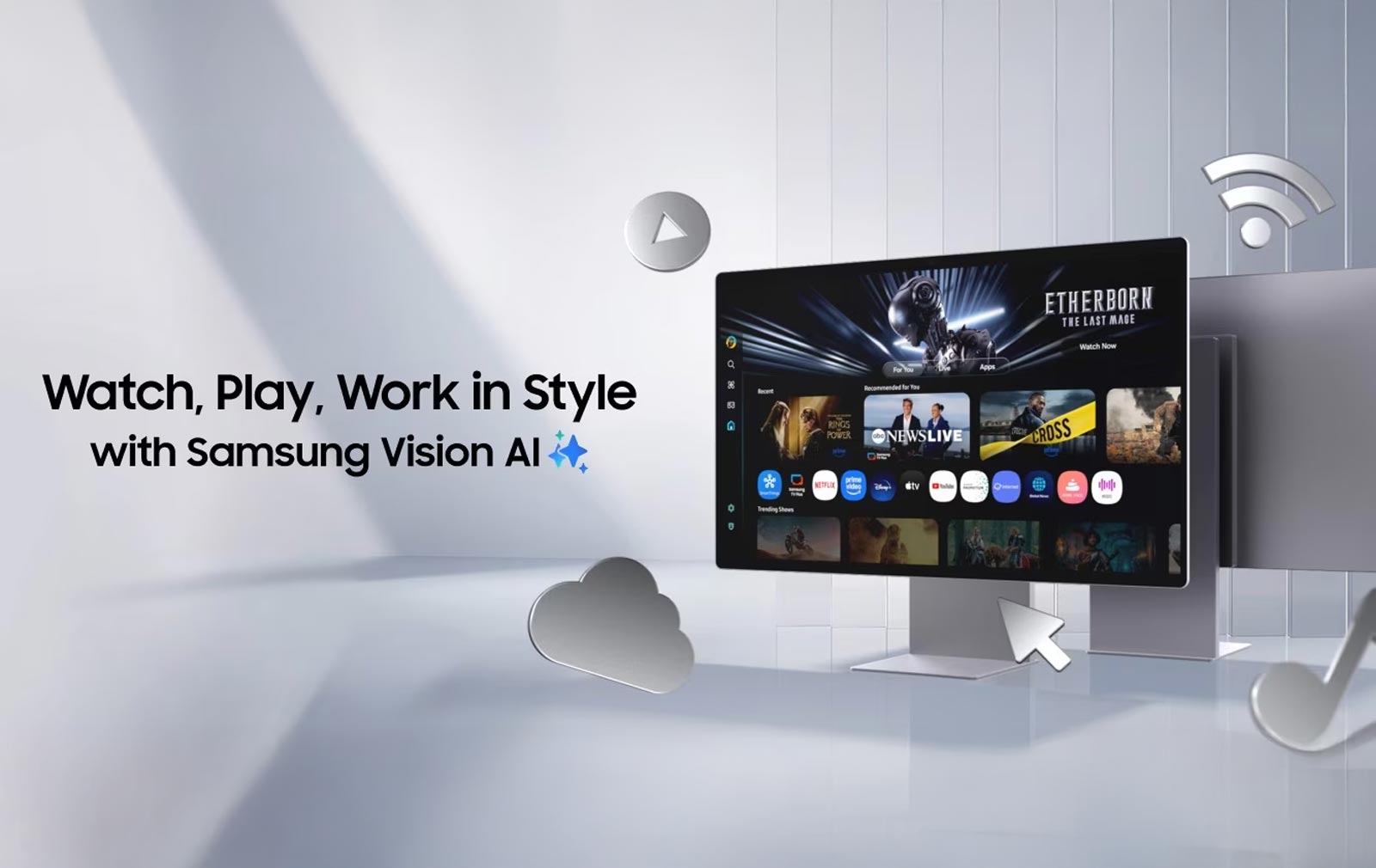 Im Gegensatz zu klassischen Monitoren vereint der M9 Funktionen eines Smart TV und eines Computers in einem Gerät. Er läuft mit dem Tizen‑Betriebssystem und bietet direkten Zugriff auf Smart‑TV‑Apps, Streamingdienste, Sprachassistenten wie Bixby oder Alexa. Der M9 verfügt außerdem über KI‑gestützte Features wie 4K AI Upscaling Pro und AI Picture Optimizer, die Inhalte automatisch verbessern. Die smarte Funktionalität wird durch WLAN‑ und Bluetooth‑Konnektivität sowie kabelloses Spiegeln per Tap View unterstützt.